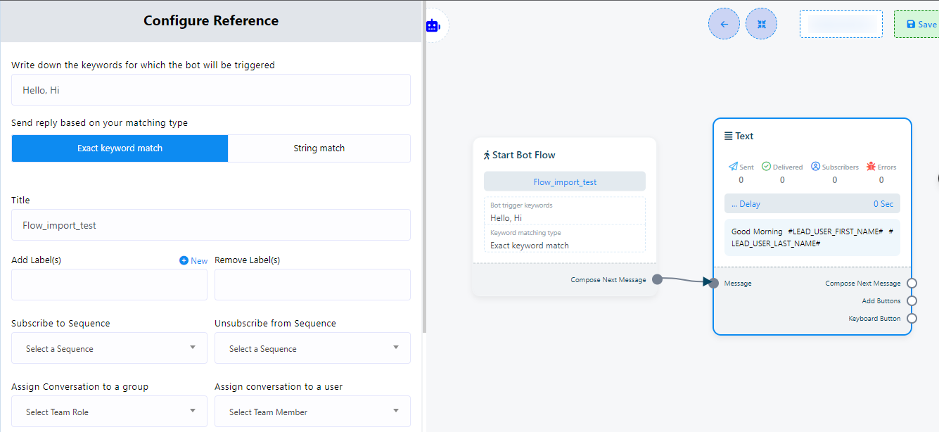 Flow Import: Flow Import, is the counterpart process to Flow Export. It involves taking a previously saved or externally created bot flow, often in a `.txt` and importing it into bot flow builder. This allows users to quickly integrate pre-defined conversational flows, bot structures into their projects without the need to recreate them manually. Flow Import simplifies the setup and configuration of chatbots by incorporating pre-existing bot flows.